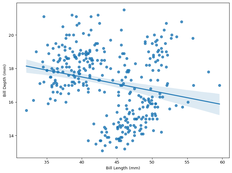 # add linear fit linesns.regplot( data=df, x='bill_len', y='bill_dep', scatter=True, ci=95)plt.xlabel('Bill Length (mm)')plt.ylabel('Bill Depth (mm)')plt.tight_layout()plt.show()