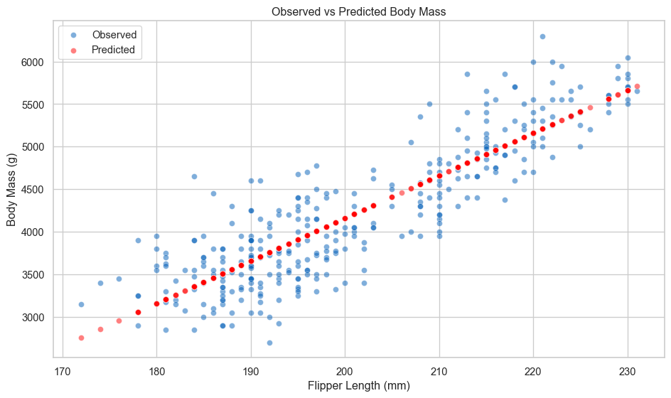 print(df[['flipper_len', 'body_mass', 'predicted_mass', 'residual']].head(10))Sample predictions: