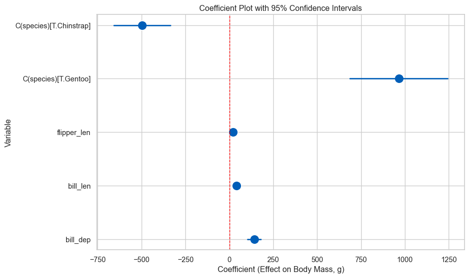 print(df[['flipper_len', 'body_mass', 'predicted_mass', 'residual']].head(10))Sample predictions: