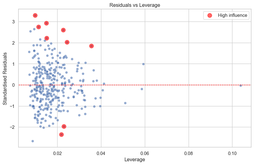 sns.scatterplot(x=leverage, y=standardised_residuals, alpha=0.6, ax=axes[1, 1])