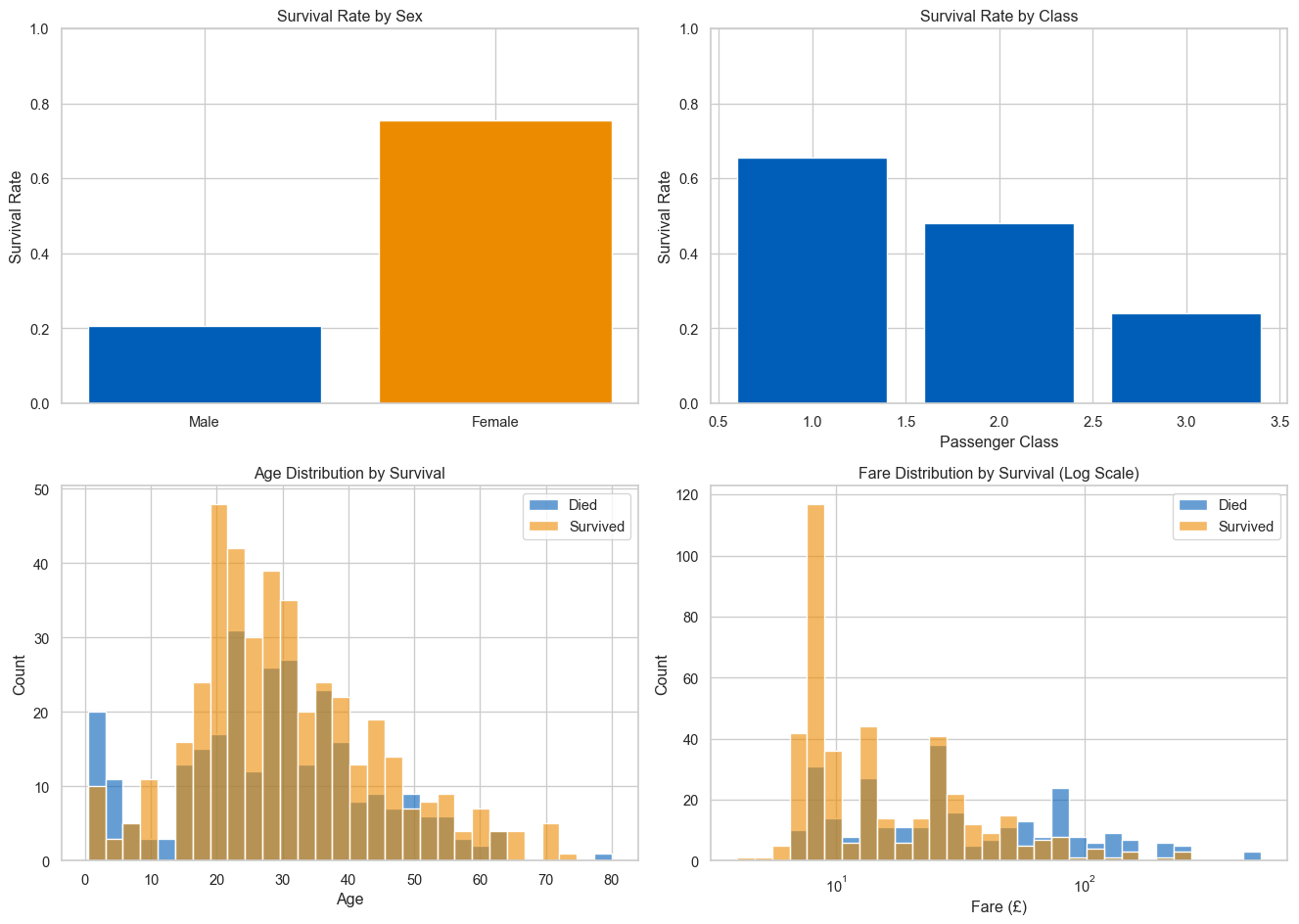 fig, axes = plt.subplots(2, 2, figsize=(14, 10))# survival by sexsurvival_sex = df.groupby('Sex')['Survived'].mean()axes[0, 0].bar(['Male', 'Female'], survival_sex.values, color=['#005EB8', '#ED8B00'])axes[0, 0].set_ylabel('Survival Rate')axes[0, 0].set_title('Survival Rate by Sex')axes[0, 0].set_ylim(0, 1)# survival by classsurvival_class = df.groupby('Pclass')['Survived'].mean()axes[0, 1].bar(survival_class.index, survival_class.values, color='#005EB8')axes[0, 1].set_xlabel('Passenger Class')axes[0, 1].set_ylabel('Survival Rate')axes[0, 1].set_title('Survival Rate by Class')axes[0, 1].set_ylim(0, 1)# age distribution by survivalsns.histplot(data=df, x='Age', hue='Survived', bins=30, ax=axes[1, 0], palette={0: '#ED8B00', 1: '#005EB8'}, alpha=0.6)axes[1, 0].set_title('Age Distribution by Survival')axes[1, 0].set_xlabel('Age')axes[1, 0].legend(['Died', 'Survived'])# fare distribution by survivalsns.histplot(data=df, x='Fare', hue='Survived', bins=30, ax=axes[1, 1], palette={0: '#ED8B00', 1: '#005EB8'}, alpha=0.6, log_scale=True)axes[1, 1].set_title('Fare Distribution by Survival (Log Scale)')axes[1, 1].set_xlabel('Fare (£)')axes[1, 1].legend(['Died', 'Survived'])plt.tight_layout()plt.show()