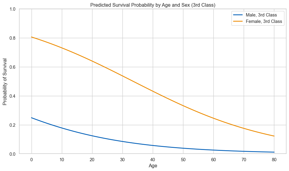 # create a grid of ages and predict survival probability for male/female passengersage_range = np.linspace(0, 80, 100)# predictions for male, 3rd class passengersX_male = pd.DataFrame({'Sex': 0,'Age': age_range,'Pclass': 3,'Fare': df['Fare'].median()})# predictions for female, 3rd class passengersX_female = pd.DataFrame({'Sex': 1,'Age': age_range,'Pclass': 3,'Fare': df['Fare'].median()})prob_male = clf.predict_proba(X_male)[:, 1]prob_female = clf.predict_proba(X_female)[:, 1]fig, ax = plt.subplots(figsize=(10, 6))sns.lineplot(x=age_range, y=prob_male, color='#005EB8', linewidth=2, label='Male, 3rd Class', ax=ax)sns.lineplot(x=age_range, y=prob_female, color='#ED8B00', linewidth=2, label='Female, 3rd Class', ax=ax)ax.set_xlabel('Age')ax.set_ylabel('Probability of Survival')ax.set_title('Predicted Survival Probability by Age and Sex (3rd Class)')ax.set_ylim(0, 1)ax.legend()plt.tight_layout()plt.show()