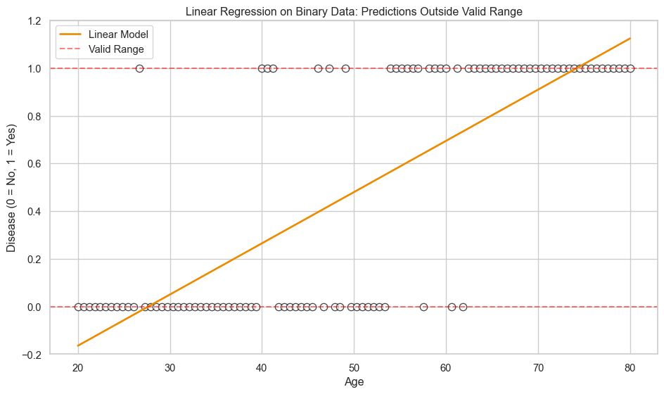 import pandas as pdimport numpy as npimport matplotlib.pyplot as pltimport seaborn as snsfrom sklearn.linear_model import LinearRegression, LogisticRegression# set visualisation stylesns.set_theme(style="whitegrid")plt.rcParams['figure.figsize'] = (10, 6)# simulate binary outcome datanp.random.seed(42)age = np.linspace(20, 80, 100)prob_true =1/ (1+ np.exp(-(age -50) /8))disease = np.random.binomial(1, prob_true)# fit linear regressionmodel_linear = LinearRegression()model_linear.fit(age.reshape(-1, 1), disease)pred_linear = model_linear.predict(age.reshape(-1, 1))# plotfig, ax = plt.subplots(figsize=(10, 6))sns.scatterplot(x=age, y=disease, facecolors='white', edgecolors='black', s=60, linewidths=1, alpha=0.7, ax=ax)sns.lineplot(x=age, y=pred_linear, color='#ED8B00', linewidth=2, ax=ax, label='Linear Model')ax.axhline(y=0, color='red', linestyle='--', alpha=0.5, label='Valid Range')ax.axhline(y=1, color='red', linestyle='--', alpha=0.5)ax.set_xlabel('Age')ax.set_ylabel('Disease (0 = No, 1 = Yes)')ax.set_title('Linear Regression on Binary Data: Predictions Outside Valid Range')ax.set_ylim(-0.2, 1.2)ax.legend()plt.tight_layout()plt.show()