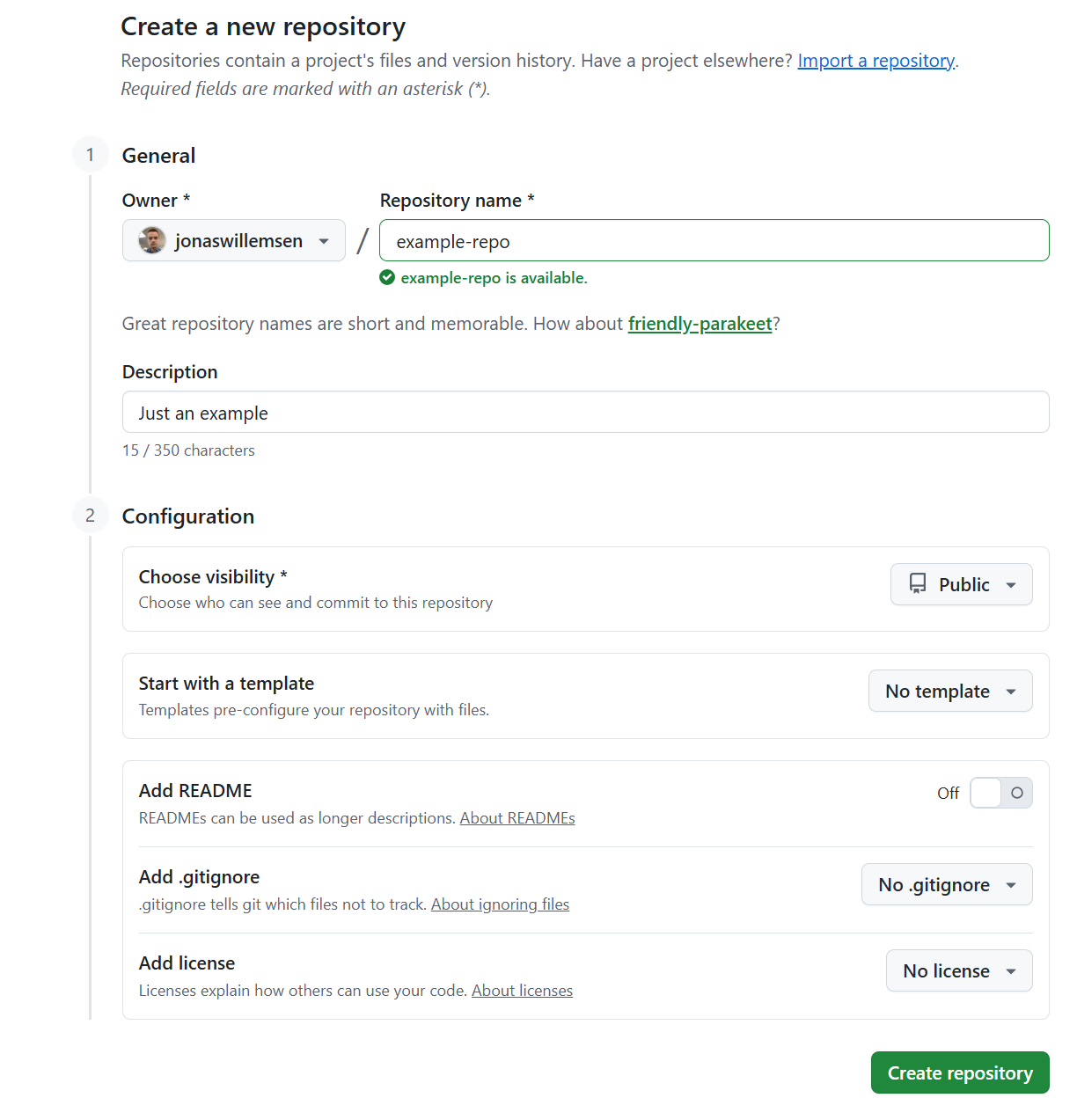 Once you’ve got a Github account, creating a repository is very simple. On github.com/new, there’s a single screen that lets you create a blank repository. The key thing is choosing whether the repo is going to sit under your personal account or under an organisation, and deciding whether it is going to be public or private.