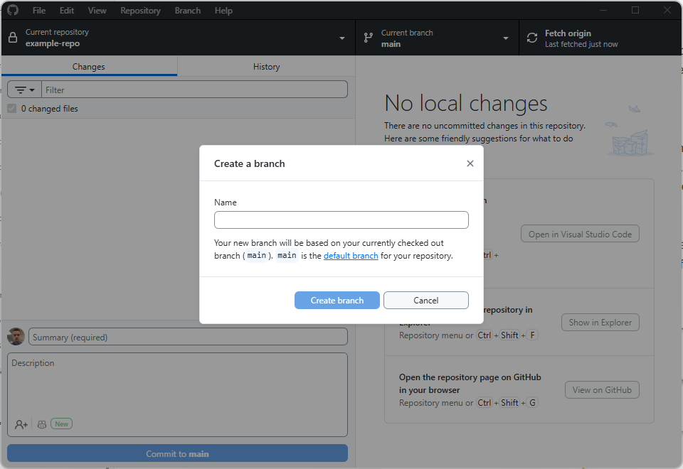 In Github Desktop, you can create a new branch by clicking on the “Current Branch” dropdown at the top and selecting “New Branch”. Give it a descriptive name like “add-data-validation” or “update-documentation”.