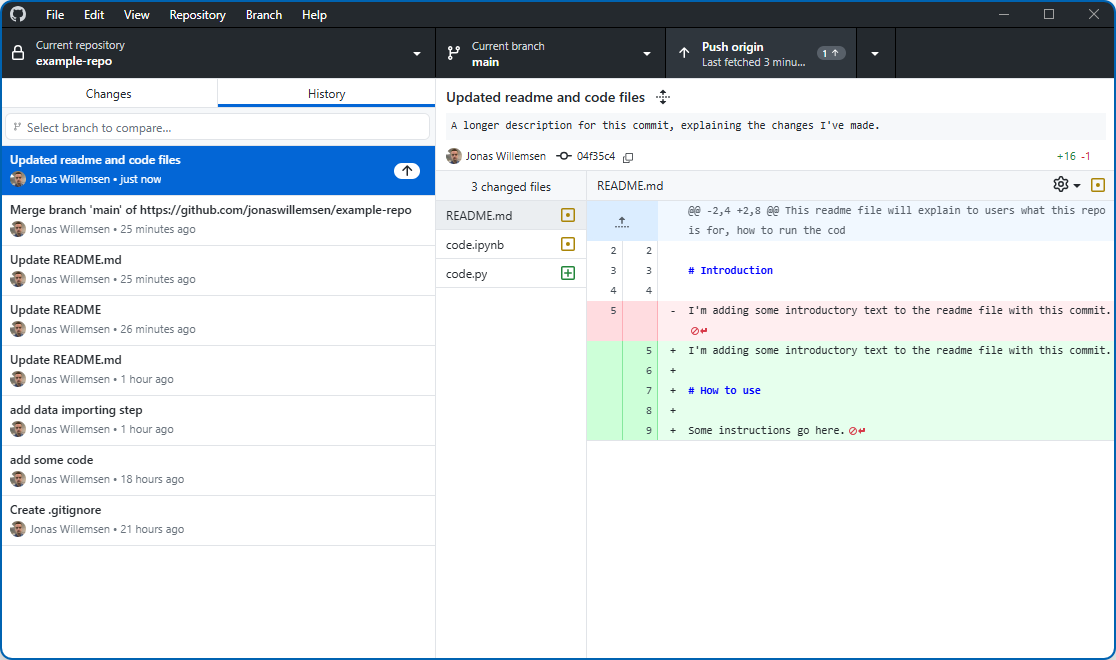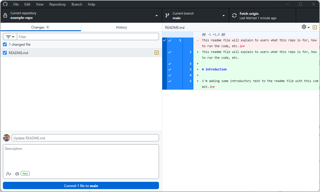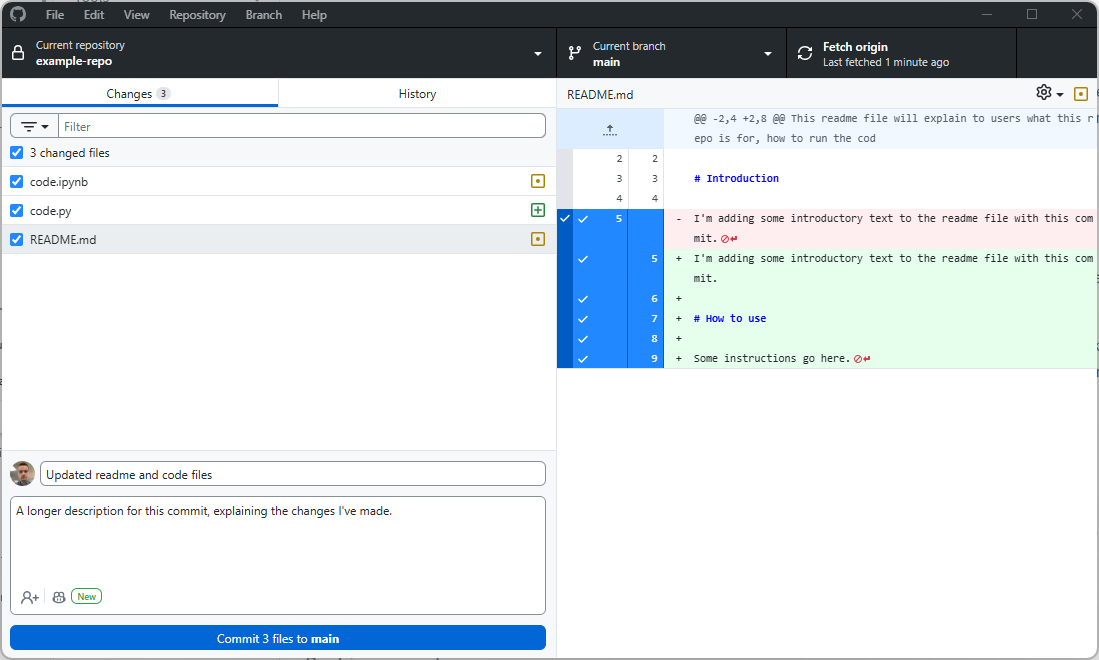 Once we’ve set up our repo in Github Desktop, any changes to the local folder (with the exception of anything covered by gitignore) will automatically be detected. The app will helpfully show us which files have been added, removed, or changed, and for the latter it will directly show which lines have been altered: