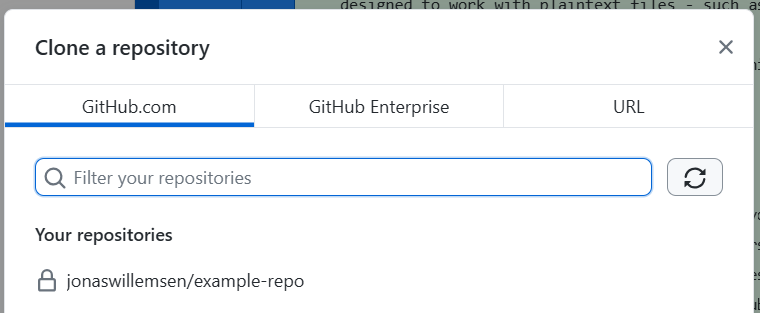 In Github Desktop, assuming you’re logged into your Github account that has access to the repo you want to clone, you should see it in the list when you click File > Clone Repository: