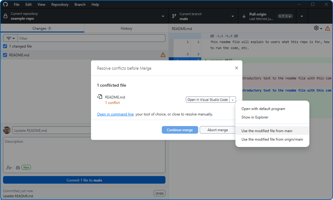 Once you’re on a branch, any commits you make will only affect that branch. You can switch back to main (or any other branch) at any time using the same dropdown. When your work on the branch is complete, you’ll typically merge it back into main using a pull request (covered in the Collaboration section).