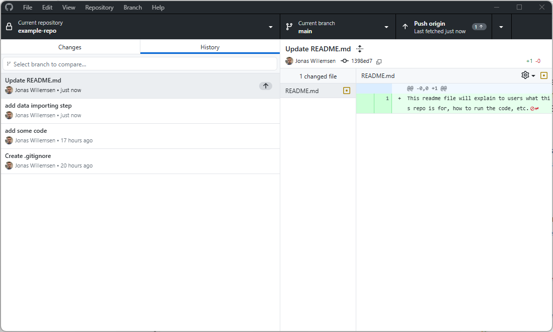 One of the most powerful features of git is the ability to see your project’s complete history. In Github Desktop, click on the “History” tab (next to “Changes”) to see a list of all commits that have been made to the repository.