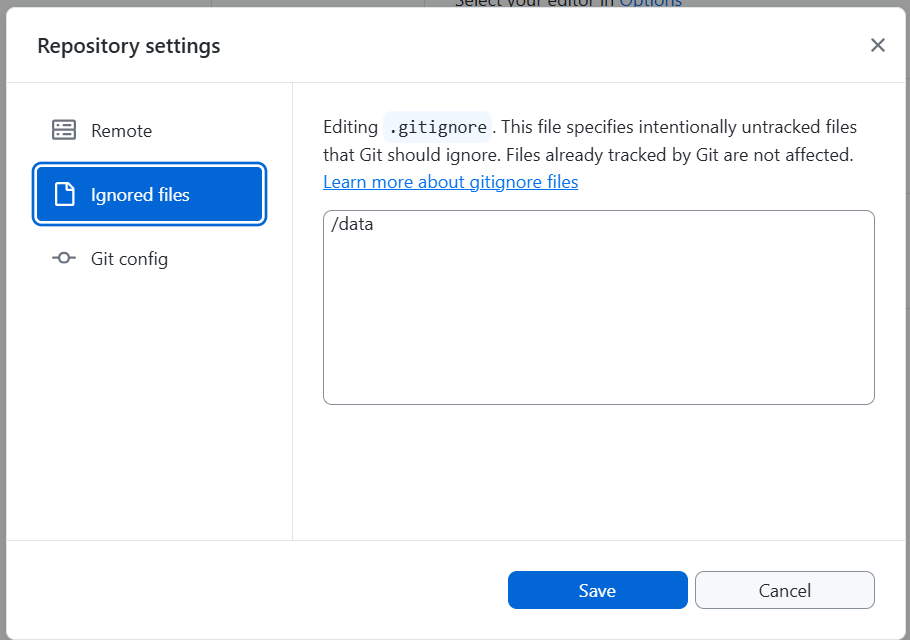 We can also go to Repository > Repository Settings… and see everything currently in our gitignore file.