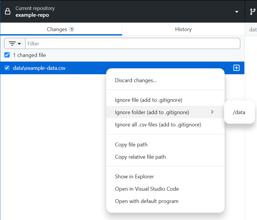 Github Desktop makes this very easy. When we’ve added some files or folders that we want git to ignore, we just right click within the changes list and add either the individual files or entire folders to gitignore - once we’ve done this, git will disregard these files and folders, refrain from pushing them to the remote repo, and not track any changes made to them.