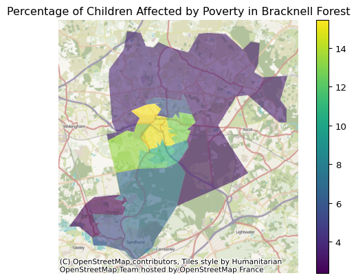 import contextily as cxLet’s plot “Child Poverty, Income deprivation affecting children index (IDACI) 2019 Proportion %” in Bracknell Forest Local Authority area by MSOA. Let’s imagine we found this metric on the Fingertips website and want to import the data so that we can create a custom visualisation to go into some background narrative to a report.