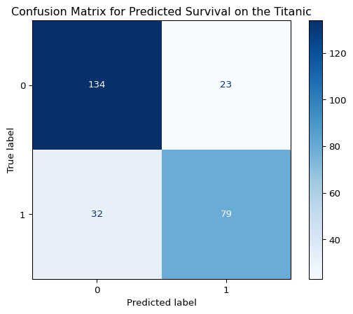plt.title("Confusion Matrix for Predicted Survival on the Titanic")